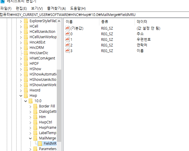 그다음 SOFTWARE>>HNC>>Hwp>>MailMerge>>FieldMRU 순으로 들어가면