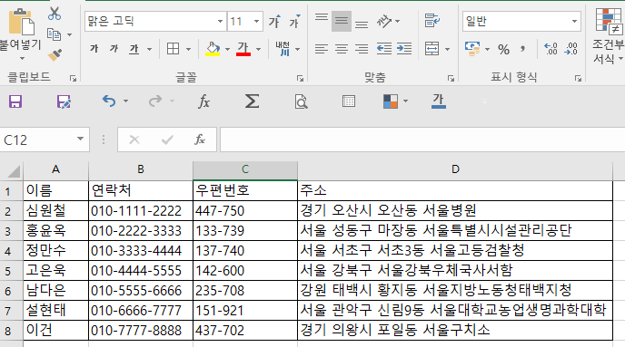 구글에서 랜덤주소 생성기와 랜덤이름 생성기를 이용하여 엑셀로 주소록을 만들어봤어