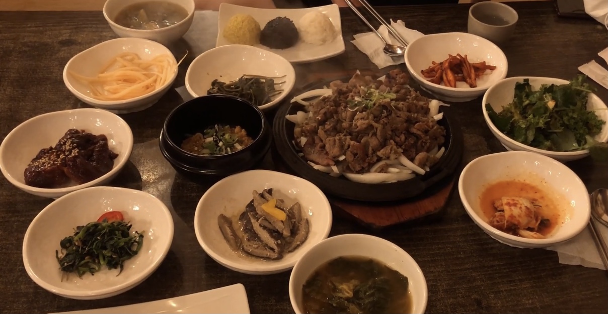 밥은 정식을 시켜서 먹었고 불맛나는 고기와 각종 밑반찬들이 깔렸다.