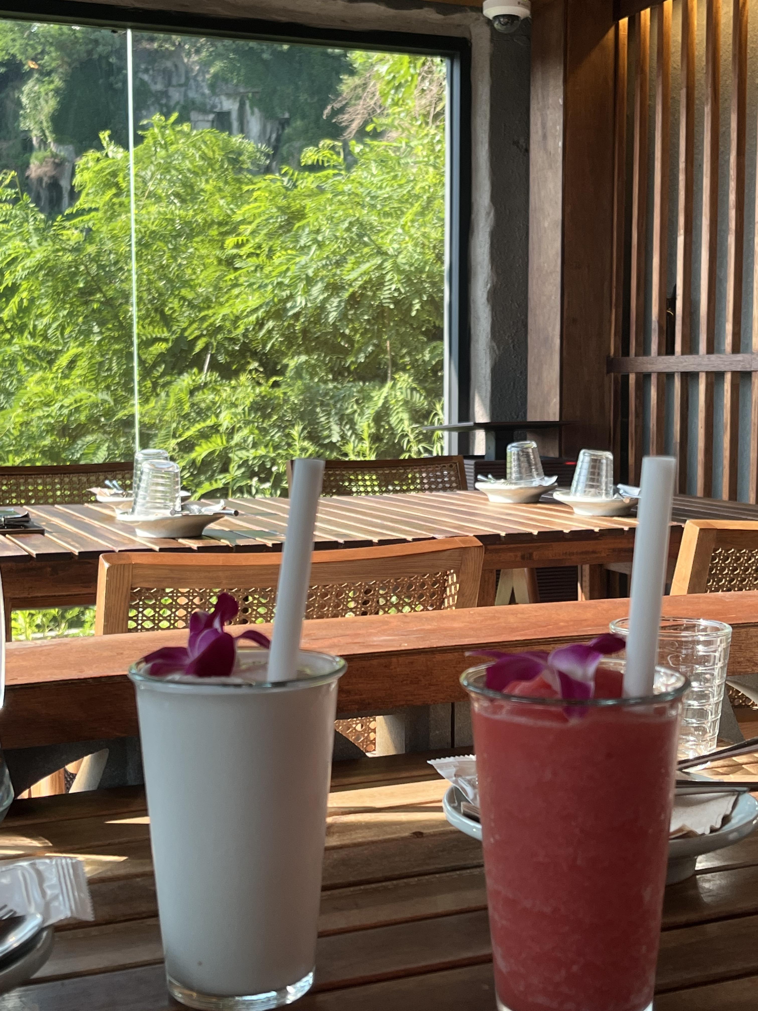 옆쪽의 단체석 창가에 절벽풍경이 들어왔고 바람에 흔들리는 나뭇잎이 평온함을 주었다.