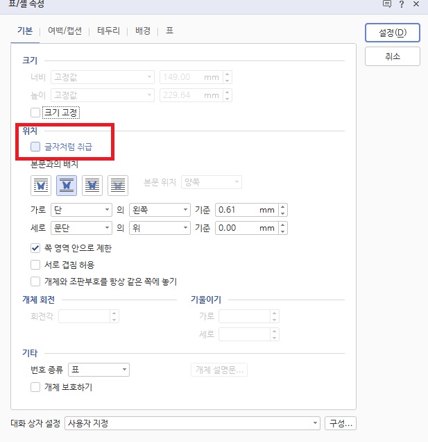 2. 기본탭 >> 글자처럼 취급이 체크되어있다면 체크해제