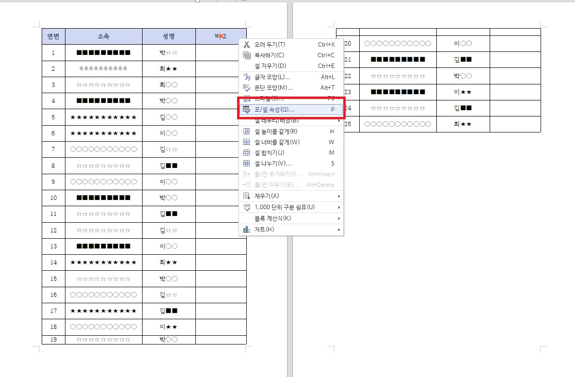 1. 먼저 표를 선택하고 개체속성을 눌러줘