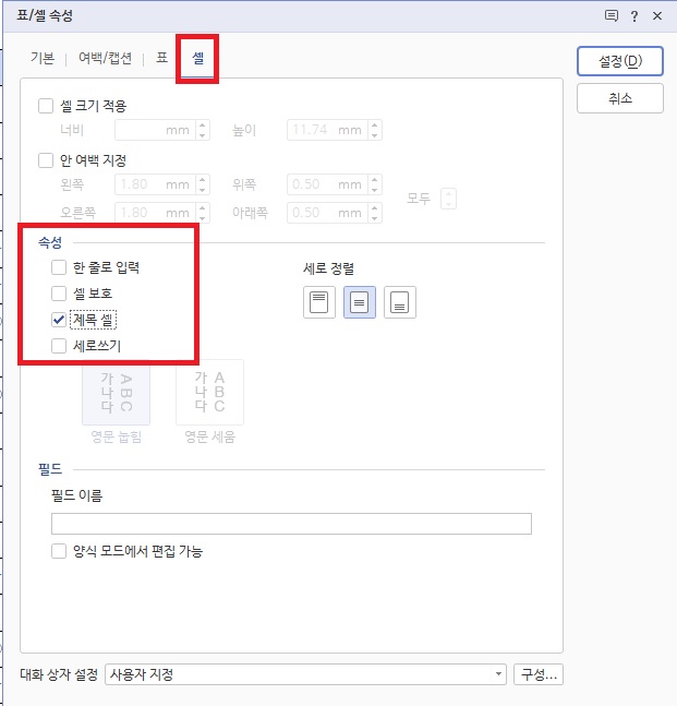 5. 셀텝 선택>>제목 셀 체크