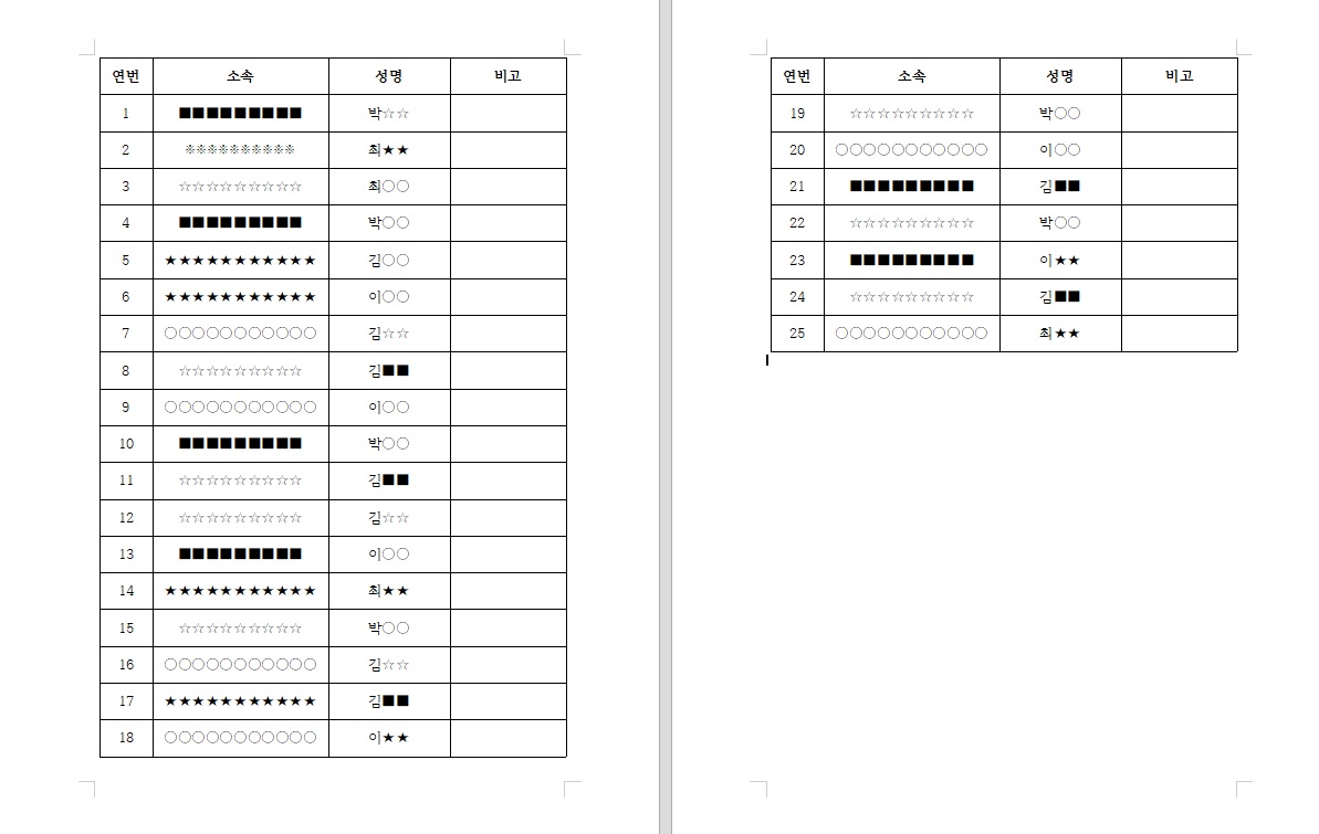 보이는 것 과 같이 페이지가 넘어 가면서 19번 열의 셀이 이상하게 나뉘고 제목셀(연번, 소속, 성명, 비고 작성된 첫행)이